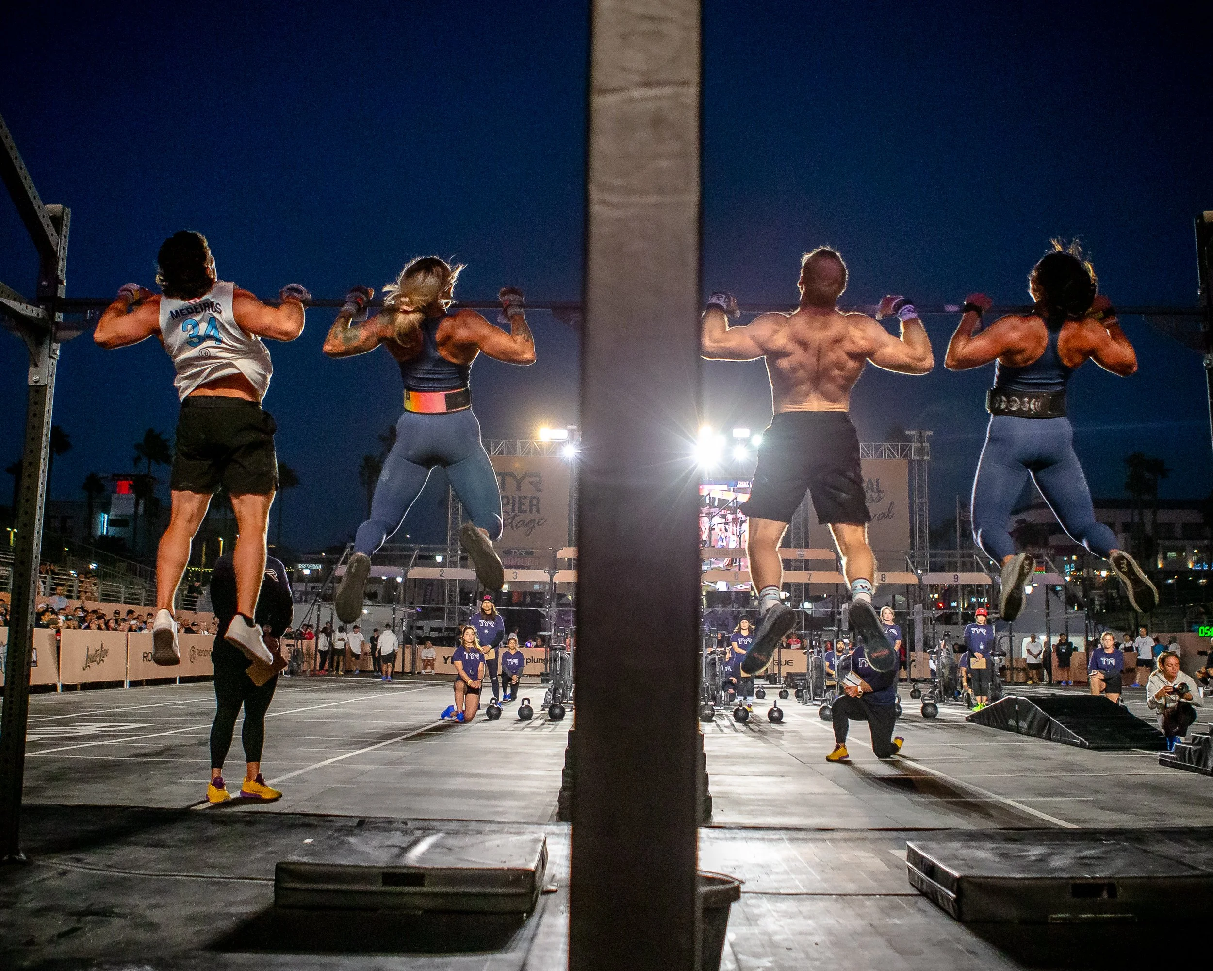 At the completion of the 28th team synchro bar facing burpee, teams will sprint to finish and time will stop when the last athlete touches the chess piece.